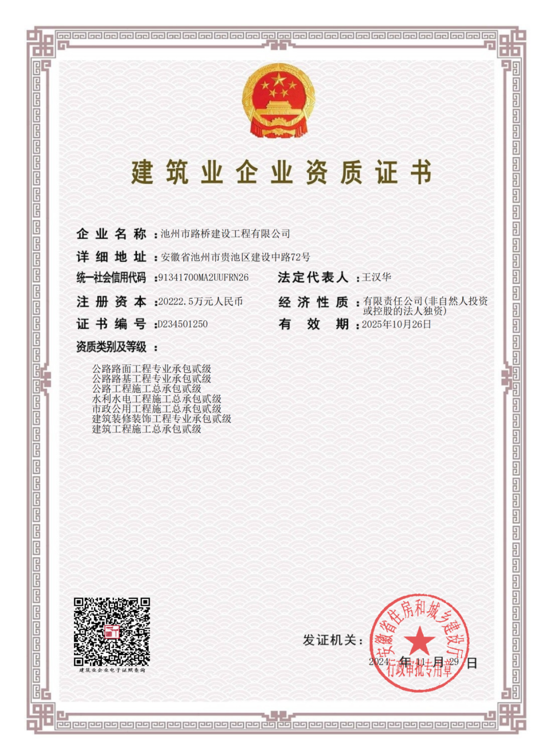 池州市路橋建設(shè)工程有限公司獲批水利水電工程施工總承包資質(zhì)貳級