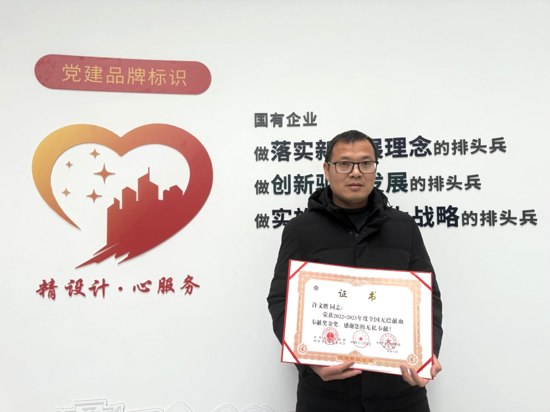 近日,集團所屬設(shè)計總院員工許文勝同志榮獲由國家衛(wèi)生健康委員會、中國紅十字會總會、中央軍委后勤保障部衛(wèi)生局頒發(fā)的“2022—2023年度全國無償獻血獎金獎”,以表彰他二十年如一日的無償奉獻。
