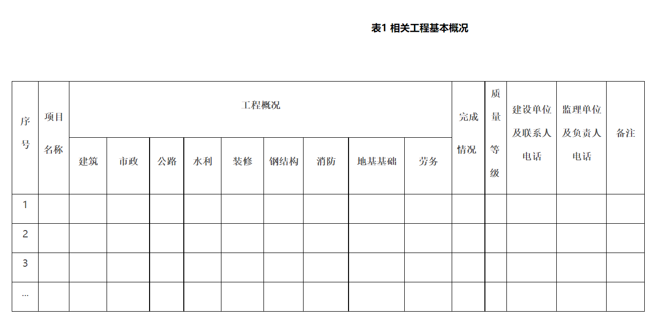 3、各公司根據(jù)本企業(yè)的資質(zhì)范圍,分別填報(bào)相應(yīng)的業(yè)績(jī)材料(如房屋建筑、市政工程、公路橋梁工程、水利(電)工程、地基及基礎(chǔ)處理工程等)。(見(jiàn)表1)