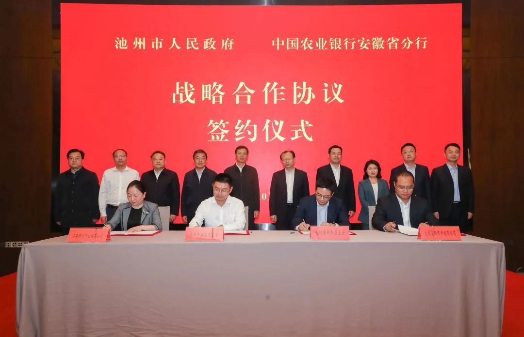 1012日下午,池州市政府與中國農(nóng)業(yè)銀行安徽省分行舉行戰(zhàn)略合作協(xié)議簽約儀式。簽約儀式上,池州市政府與中國農(nóng)業(yè)銀行安徽省分行簽訂《戰(zhàn)略合作協(xié)議》;集團旗下產(chǎn)業(yè)發(fā)展基金有限公司、農(nóng)銀金融資產(chǎn)投資有限公司、合肥博軒私募基金管理有限公司、安徽江南新興產(chǎn)業(yè)投資有限公司共同簽訂《農(nóng)銀國軒新材料基金合作框架協(xié)議》。