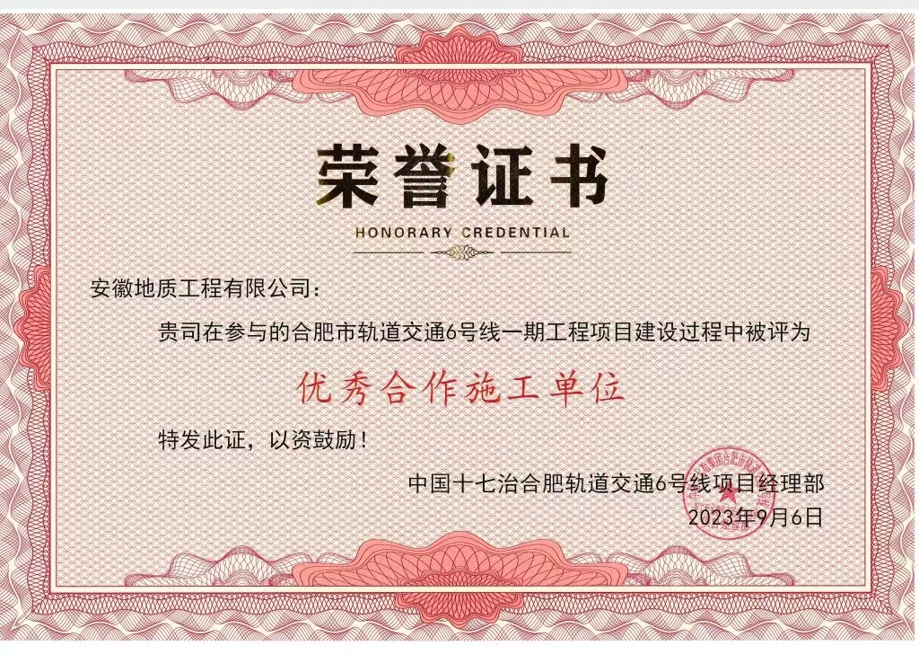 近日,建投集團(tuán)所屬安徽地質(zhì)工程有限公司喜獲中國(guó)十七冶合肥軌道交通6號(hào)線項(xiàng)目經(jīng)理部頒發(fā)的“優(yōu)秀合作施工單位”榮譽(yù)稱號(hào),這是對(duì)地質(zhì)工程公司在該項(xiàng)目施工過(guò)程中的突出表現(xiàn)的肯定。